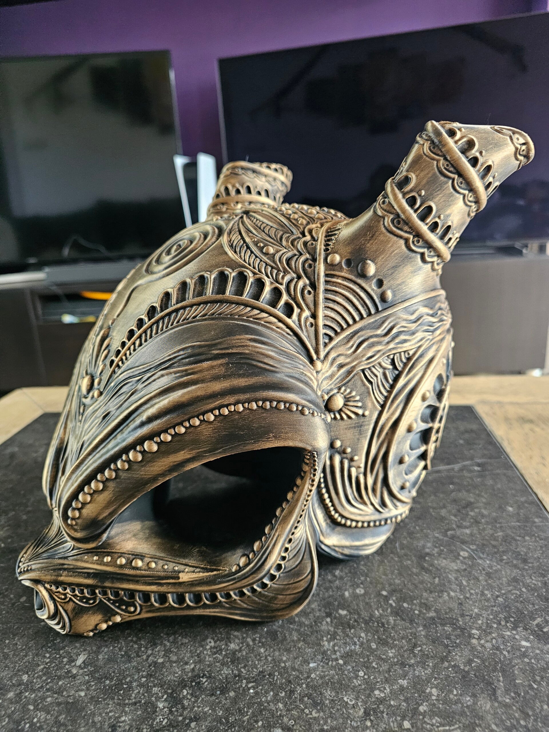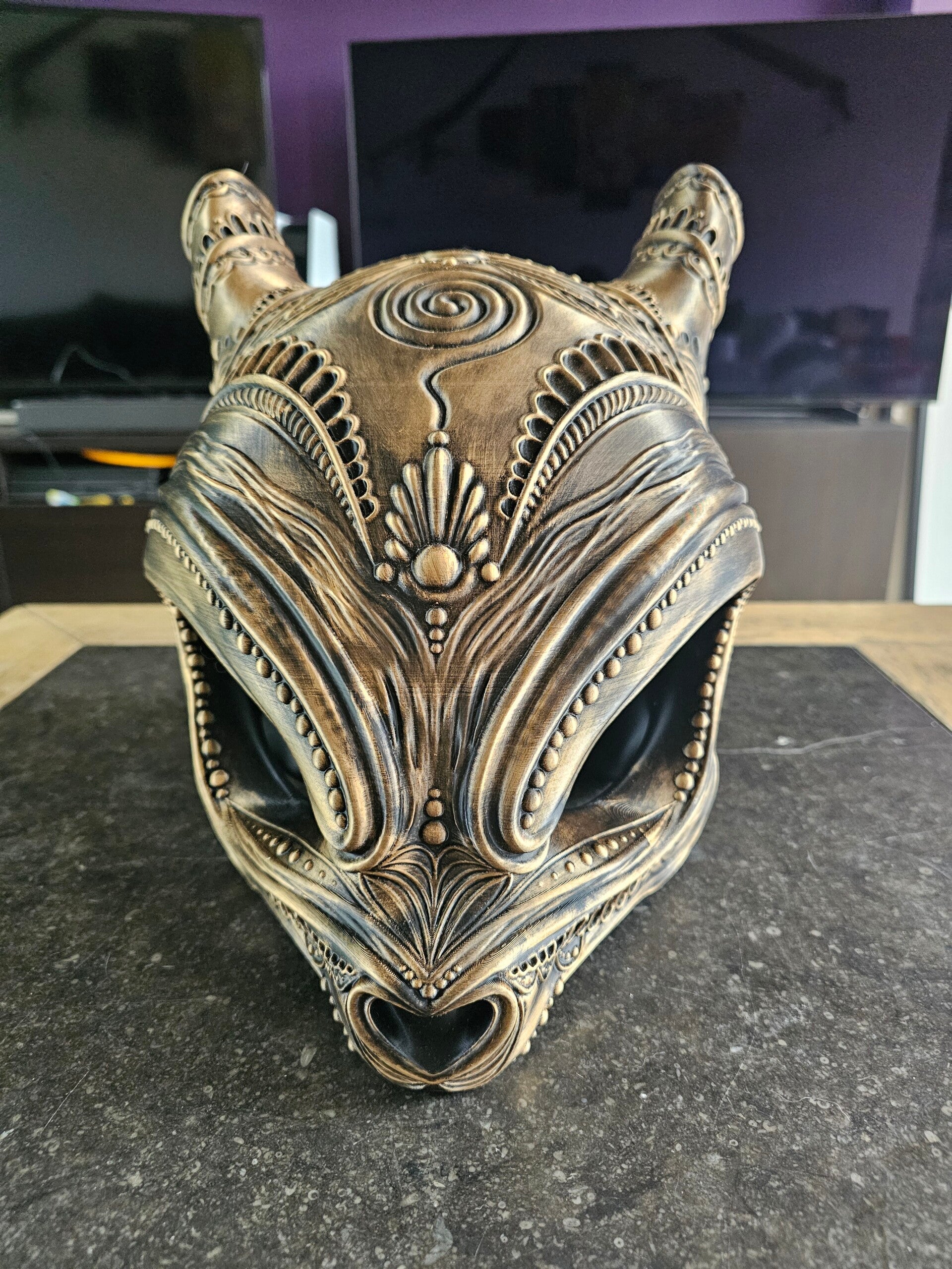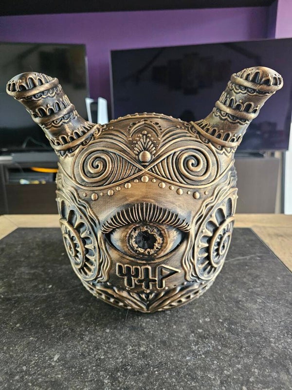 De mewtwo masker is ongeveer 27 cm hoog en is geprint met een FDM-printer en is met de hand geverfd met rub n buff